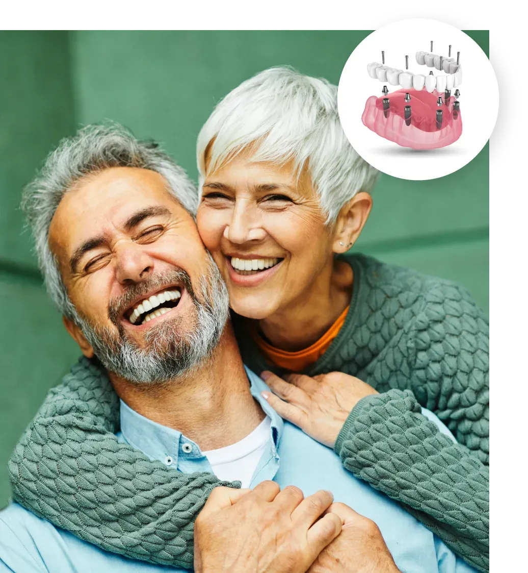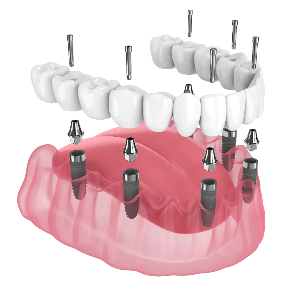 A complete set of teeth - upper, lower, or both - permanently attached to 4-6 implants per arch. They never come out. You brush them like normal teeth. You eat whatever you want.